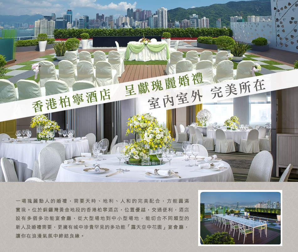 一場瑰麗動人的婚禮,需要天時、地利、人和的完美配合,方能圓滿實現。位於銅鑼灣黃金地段的香港柏寧酒店,位置優越,交通便利,酒店設有多個多功能宴會廳,從大型場地到中小型場地,能切合不同類型的新人及婚禮需要,更擁有城中珍貴罕見的多功能「露天空中花園」宴會廳,讓你在浪漫氣氛中締結良緣。