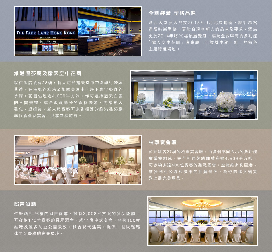 全新裝潢 型格品味 酒店大堂及大門於2015年9月完成翻新,設計風格盡顯時尚型格,更貼合現今新人的品味及要求。酒店更於2014年將28樓頂層變身,成為全城罕有的多功能「露天空中花園」宴會廳,可謂城中獨一無二的特色主題婚禮場地。